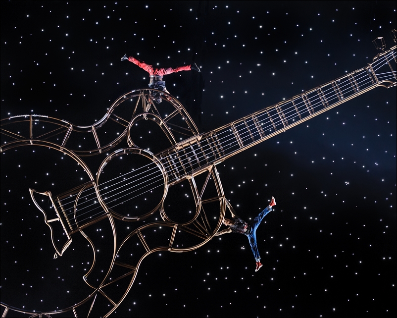 their way around a gigantic guitar-shaped metal framework suspended from above. The men