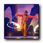 while two cowboys spin their guns and twirl their lassos in a playful routine.