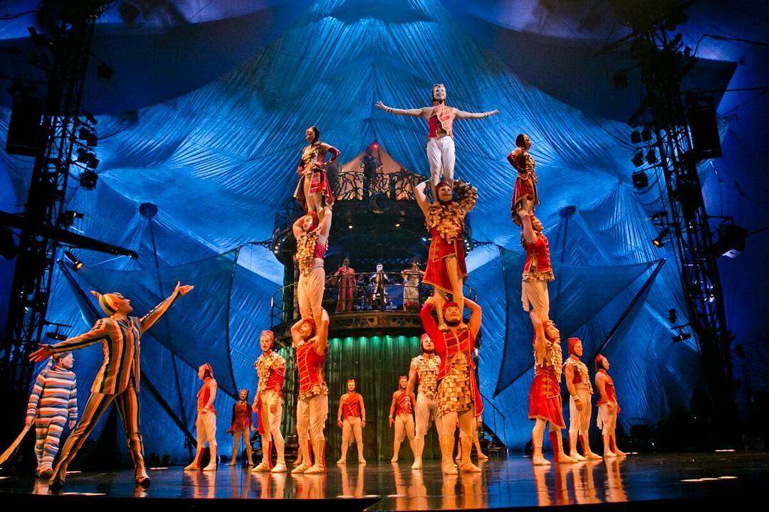 trampolines set in the stage. The act highlights include human pyramids, bodies flying