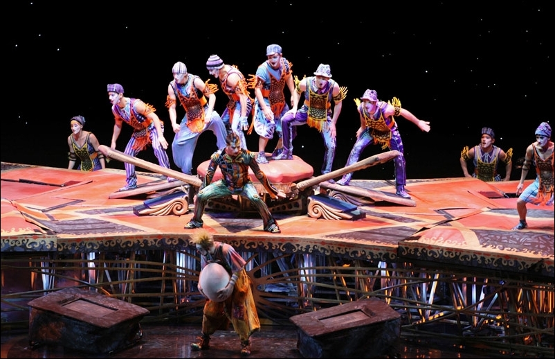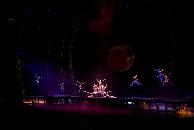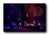 In a veritable tribute to weightlessness, acrobats present an act combining two disciplines: Teeterboard and Trampoline. A flurry of criss-crossing flights, rebounds, daring leaps and jumps takes over the stage.